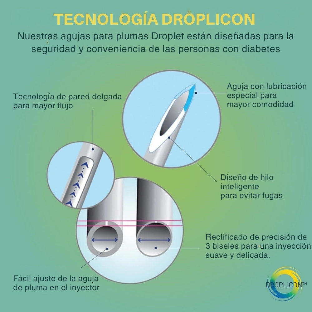 Suavidad:Rectificado de precisión de 3 biseles. Método exclusivo de lubricación DROPLICON™ desarrollado internamente para una inyección suave y delicada.